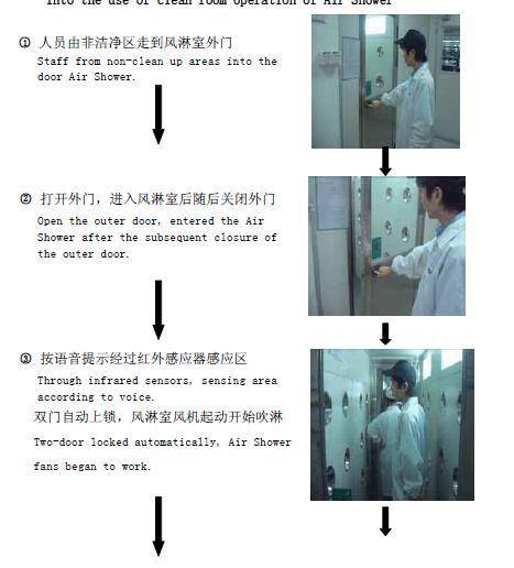 Through infrared sensors, sensing area according to voice.Two-door locked automatically, Air Shower fans began to work.
